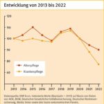 Am stärksten gehen die Werte in beiden Berufsfeldern in der Dimension „Arbeits- und Erwerbsfähigkeit“ zurück: in der Altenpflege um 23 Punkte von 48 auf 25 Punkte gegenüber 2021, in der Krankenpflege um 17 Punkte von 24 auf 7 Punkte. Berücksichtigt sind hier die Zahl der Arbeitsunfähigkeitstage der in der Pflege Beschäftigten (AOK) sowie deren relatives Risiko für Arbeitsunfälle und Berufskrankheiten (BGW/DGUV) sowie für die Inanspruchnahme von Erwerbsminderungsrente (DRV Bund) im Vergleich zum berufsgruppenübergreifenden Risiko.