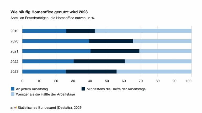 Homeoffice wird inzwischen jedoch weniger umfänglich genutzt als zu Pandemiezeiten. Im Jahr 2023 arbeitete knapp die Hälfte (44 %) der Erwerbstätigen, die Homeoffice nutzten, genauso oft oder häufiger am Arbeitsplatz als von zu Hause aus. Gut ein Viertel (26 %) war vollständig im Homeoffice. 2022 waren 39 % der Erwerbstätigen genauso oft oder häufiger am Arbeitsplatz als im Homeoffice und 31 % arbeiteten ausschließlich von zu Hause aus. Im von der Pandemie stark geprägten Jahr 2021 waren die Anteile noch deutlicher in Richtung Homeoffice-Nutzung verschoben: Damals arbeiteten lediglich 31 % genauso oft oder weniger im Homeoffice als am Arbeitsplatz, 40 % waren dagegen vollständig im Homeoffice.