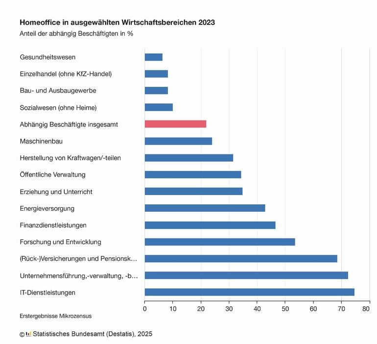 Wie häufig Homeoffice genutzt wird, hängt auch stark von der jeweiligen Branche ab. Am höchsten war der Anteil 2023 im Bereich IT-Dienstleistungen: Hier arbeiteten knapp drei Viertel (74,7 %) der abhängig Beschäftigten zumindest gelegentlich von zu Hause aus. In der Verwaltung und Führung von Unternehmen sowie in der Unternehmensberatung nahmen 72,5 % Homeoffice in Anspruch, bei Versicherungen, Rückversicherungen und Pensionskassen waren es gut zwei Drittel der Beschäftigten (68,6 %). Im Gesundheitswesen konnten mit 6,4 % anteilig die wenigsten Beschäftigten ihre Arbeit auch zu Hause ausüben. Auch eine Tätigkeit im Einzelhandel (8,3 %) oder etwa im Bau- und Ausbaugewerbe (8,4 %) war nur selten im Homeoffice möglich.