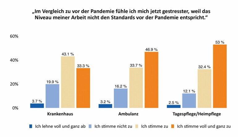 Eine Studie des Robert Koch-Instituts (RKI) zum Belastungsempfinden und Unterstützungsbedarf von Fachkräften im Gesundheitswesen während der COVID-19-Pandemie zeigt: Das Gesundheitspersonal war außergewöhnlichen Belastungen ausgesetzt, setzte sich intensiv für die Kontinuität der Versorgung ein und trug zu innovativen Lösungen während der COVID-19-Pandemie bei. Fachkräfte berichteten von hoher Arbeitsbelastung, Angst vor Infektion und anderem durch die Pandemie verursachten Stress. Bereits bestehende Defizite wie der Fachkräftemangel und die hierarchischen Strukturen im Gesundheitssystem traten während der Pandemie deutlich zutage.