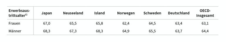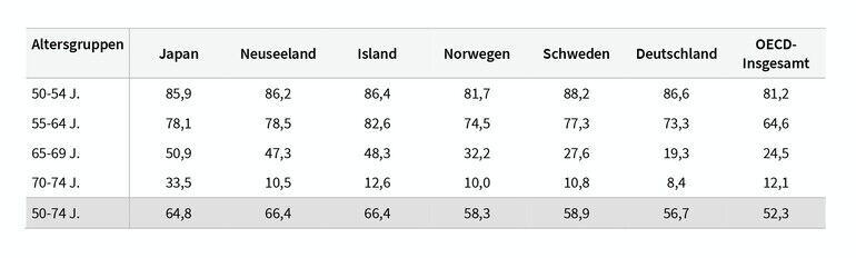 Bei den Erwerbstätigenquoten der 50–54-Jährigen wird Deutschland nur von Schweden übertroffen. Bei den 55–64-Jährigen liegen Island, Neuseeland und Japan vorne, bei den 65–69- Jährigen sind es ebenfalls diese drei Länder. Mit Japan gibt es bei der Erwerbstätigkeit der 70–74-Jährigen mit einer Erwerbstätigenquote von mehr als 30 Prozent einen Ausreißer nach oben.
