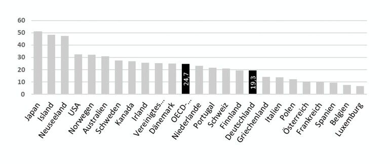 Schließlich richtet sich der Blick auf die Erwerbstätigenquote der Über-65-Jährigen und damit der zumeist rentenbeziehenden Erwerbstätigen im Jahr 2022. Hier liegt Japan vorne, unter den europäischen Ländern ist es Island. Deutschland befindet sich anders als bei den 55–64-Jährigen mit mehr als fünf Prozentpunkten unterhalb des OECD-Durchschnitts.