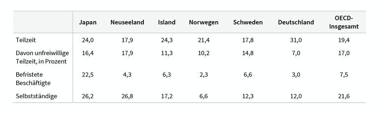 Bei den verschiedenen, von unbefristeter Vollzeit abweichenden Formen der Beschäftigung von Älteren ist Japan – abgesehen von der Teilzeitbeschäftigung – an der Spitze, die anderen Länder liegen mit ihren Werten zumeist unterhalb des OECD-Durchschnitts. Die Verbreitung bestimmter Formen der Beschäftigung und höhere Erwerbstätigenquoten Älterer müssen also nicht einhergehen.