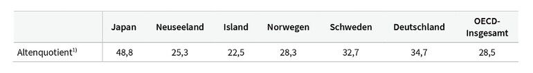 Der Altenquotient liegt im OECD-Durchschnitt bei gut 28 Prozent. Die Werte in Japan, Deutschland und Schweden liegen darüber, die für Island und Neuseeland darunter. Norwegen trifft den Durchschnittswert nahezu. Die Beispiele Island und Neuseeland machen deutlich, dass auch Länder mit einem niedrigen und damit für die Alterssicherung günstigeren Quotienten eine hohe Erwerbstätigkeit Älterer aufweisen können. Ein Zusammenhang zwischen einem herausfordernden Altenquotient und einer hohen Erwerbstätigenquote Älterer muss also nicht gegeben sein.
