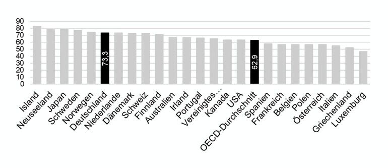 Der Vergleich der Erwerbstätigenquoten der 55–64-Jährigen in OECD-Ländern zeigt für das Jahr 2022, dass es zwischen den Ländern noch erhebliche Unterschiede gibt. Die Werte reichen von unter 50 Prozent bis etwas über 80 Prozent. Die höchsten Quoten unter den Industrieländern weisen drei skandinavische Länder (Island, Schweden und Norwegen) und zwei außereuropäische Länder (Neuseeland und Japan) auf. Direkt hinter dieser Spitzengruppe folgt bereits Deutschland, das mit gut 73 Prozent in 2022 ebenfalls weit oberhalb des OECD- Durchschnitts von knapp 63 Prozent lag. Die niedrigsten Erwerbstätigenquoten der 55–64-Jährigen verzeichneten in der Gruppe der hier ausgewählten Länder die drei EU-Staaten Italien, Griechenland und Luxemburg.