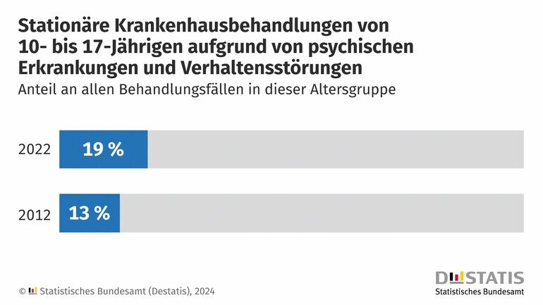 Psychische Erkrankungen und Verhaltensstörungen stellten im Jahr 2022 nach Verletzungen und Vergiftungen die zweithäufigste Ursache für stationäre Krankenhausbehandlungen von Kindern und Jugendlichen dar. Gut 81.000 der rund 435.900 Krankenhauspatientinnen und -patienten im Alter von 10 bis 17 Jahren wurden aufgrund von psychischen Erkrankungen und Verhaltensstörungen stationär behandelt. Wie das Statistische Bundesamt (Destatis) mitteilt, entsprach das 19 % aller Krankenhausbehandlungen in dieser Altersgruppe. Mädchen werden dabei häufiger aufgrund von psychischen Erkrankungen und Verhaltensstörungen im Krankenhaus behandelt: Während bei ihnen knapp ein Viertel (24 %) aller Behandlungsfälle auf diese Diagnose entfiel, waren es bei den Jungen 13 %. Insgesamt werden seit einigen Jahren anteilig immer mehr Kinder und Jugendliche wegen psychischer Erkrankungen und Verhaltensstörungen stationär behandelt. Im Jahr 2012 traf dies noch auf gut 79.300 oder 13 % der rund 589.900 Klinikpatientinnen und -patienten im Alter von 10 bis 17 Jahren zu.