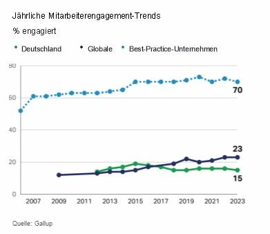 Fünfzehn Prozent der deutschen Arbeitnehmenden sind bei der Arbeit engagiert. Das Mitarbeiterengagement in Deutschland liegt zwei Prozent über dem europäischen Durchschnitt (13 %), ist aber dennoch bedeutend niedriger als der weltweite Durchschnitt von 23 Prozent. In den letzten Jahren ist das Mitarbeiterengagement in Deutschland um einen Prozentpunkt zurückgegangen, basierend auf einem rollenden Drei-Jahres-Durchschnitt.