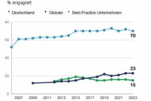 Fünfzehn Prozent der deutschen Arbeitnehmenden sind bei der Arbeit engagiert. Das Mitarbeiterengagement in Deutschland liegt zwei Prozent über dem europäischen Durchschnitt (13 %), ist aber dennoch bedeutend niedriger als der weltweite Durchschnitt von 23 Prozent. In den......